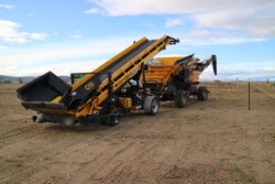 Durable 10’ wide hydraulically-controlled folding clamshell hoppers make light work of reloading rock, sand, and organic material.